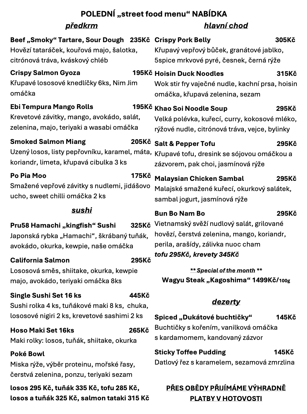 PŘES OBĚDY (11:30 – 15:00) PŘIJÍMÁME PLATBY POUZE V HOTOVOSTI